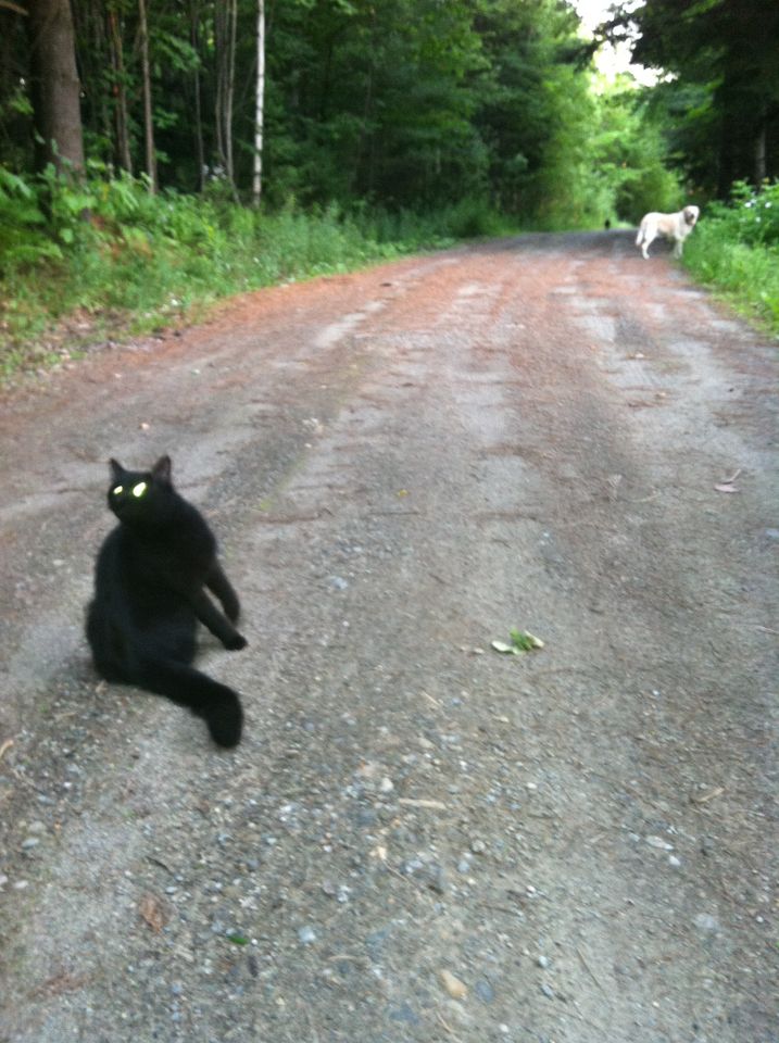 mimi, the dogs, and i go for a walk down the drivwayoutdoors, she was (and is) a great little cat. she’ll follow you anywhere, for miles, happily. she comes for pettins and has even been known to rub her face on mine every once in a while, if i’m sitting very still. she’ll purr and dart around under your hands, raising the static in her fur. every outdoor chore since mimi came to stay contains a little dose of mimi in it. in deep snow, she’s out in the pasture with me, helping to fix fence. in the heat of summer, she’s creeping through the woods with me and the dogs. every evening, she is dividing her time between looking for mice in the shed and standing in my lap while i wait for the horses to finish their grain. she follows the kids out into the beyond.