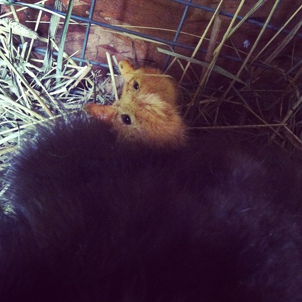 i went to lock them up one night and all four were snuggled up in the corner, the hen with one tiny, defeathered wing slung over the necks of each of two of the ducklings. about as warm as a scarf! good thing they’ve got lots of down right off the bat.