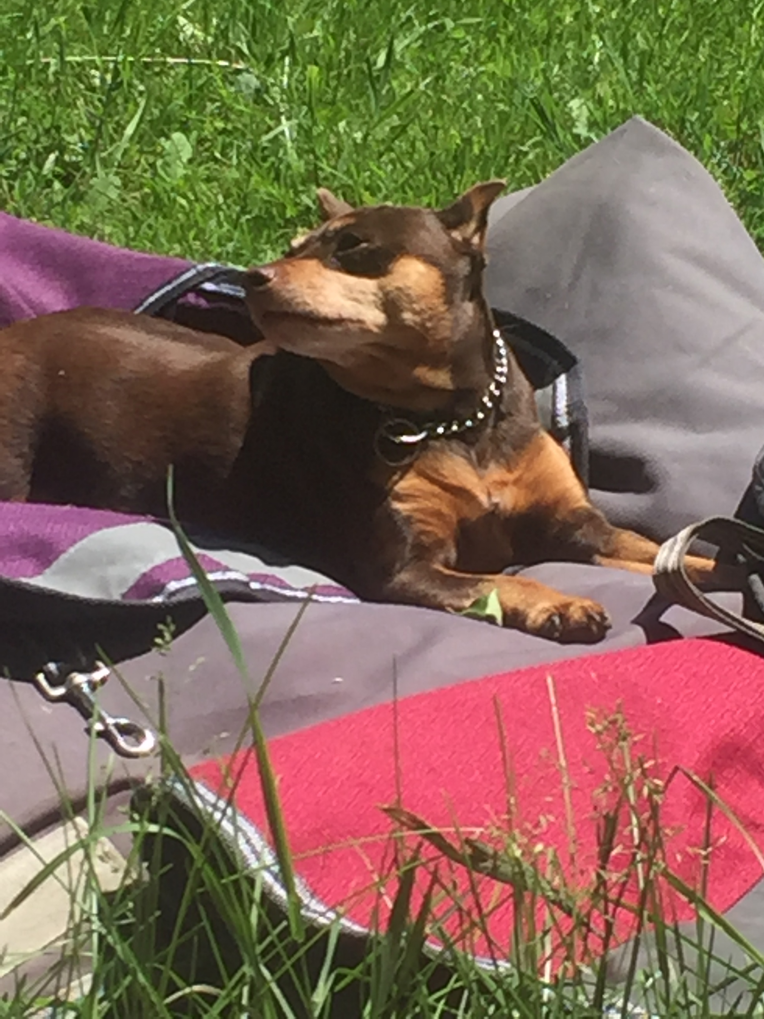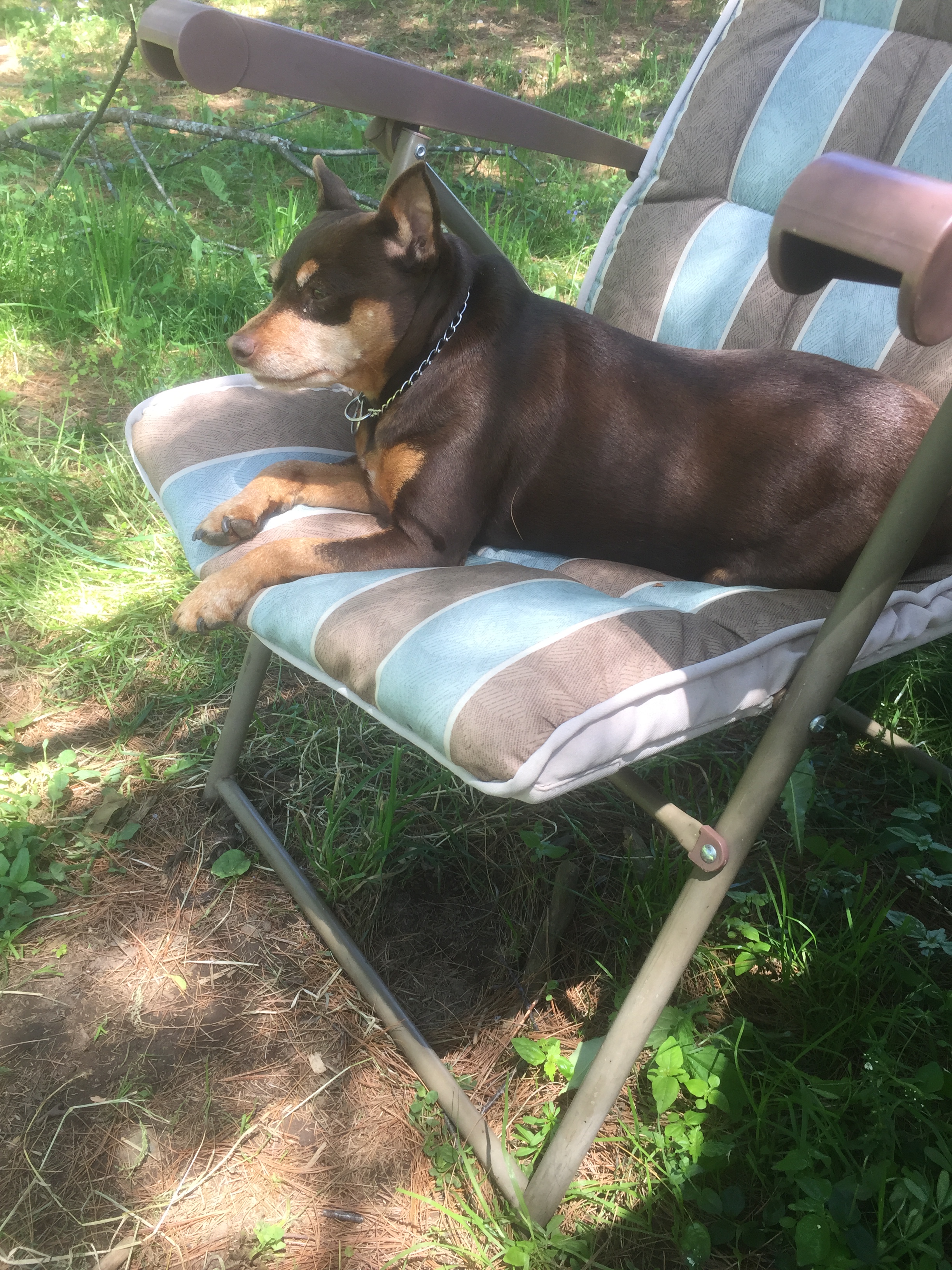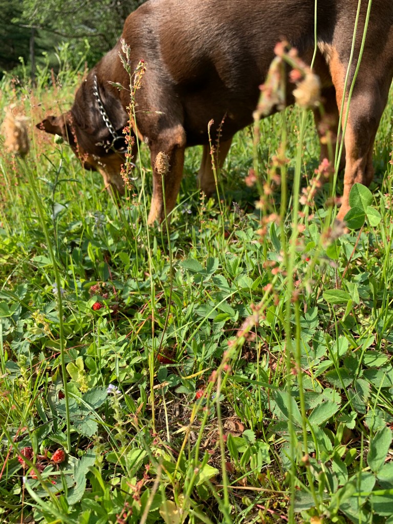 that first week was a revelation to my tiny new friend. she got bonked by a horse, learned to fight chickens for bread scraps, found nasty things to roll in, learned about wild strawberries, and spent most of her time doing her ”grass dance”, rolling with joyful abandon in the grass as though she could never get enough of it. in the intervening seven years, she did stuff like that every day. her small life became so big and beautiful. we went on long walks and discovered frogs. she hopped after them through the grasses and forests. she learned the distinct caterwaul of a cat with a mouse or a bunny or a chipmunk and moved in to claim the kill. if it was a mouse, she could gulp it all down in one go. she added blueberries and raspberries and blackberries to her list of things that amazingly grew right out there in the woods! she protected the homestead with her fierce little bork, always looking to see that i was safe. when i fell and hurt my ankle, she wouldn’t leave my side so i could load up in the car and head to the ER. she had her nose on the wind, her ears pricked up, always, and her eyes on me. her eyes led directly to her heart and back again.
