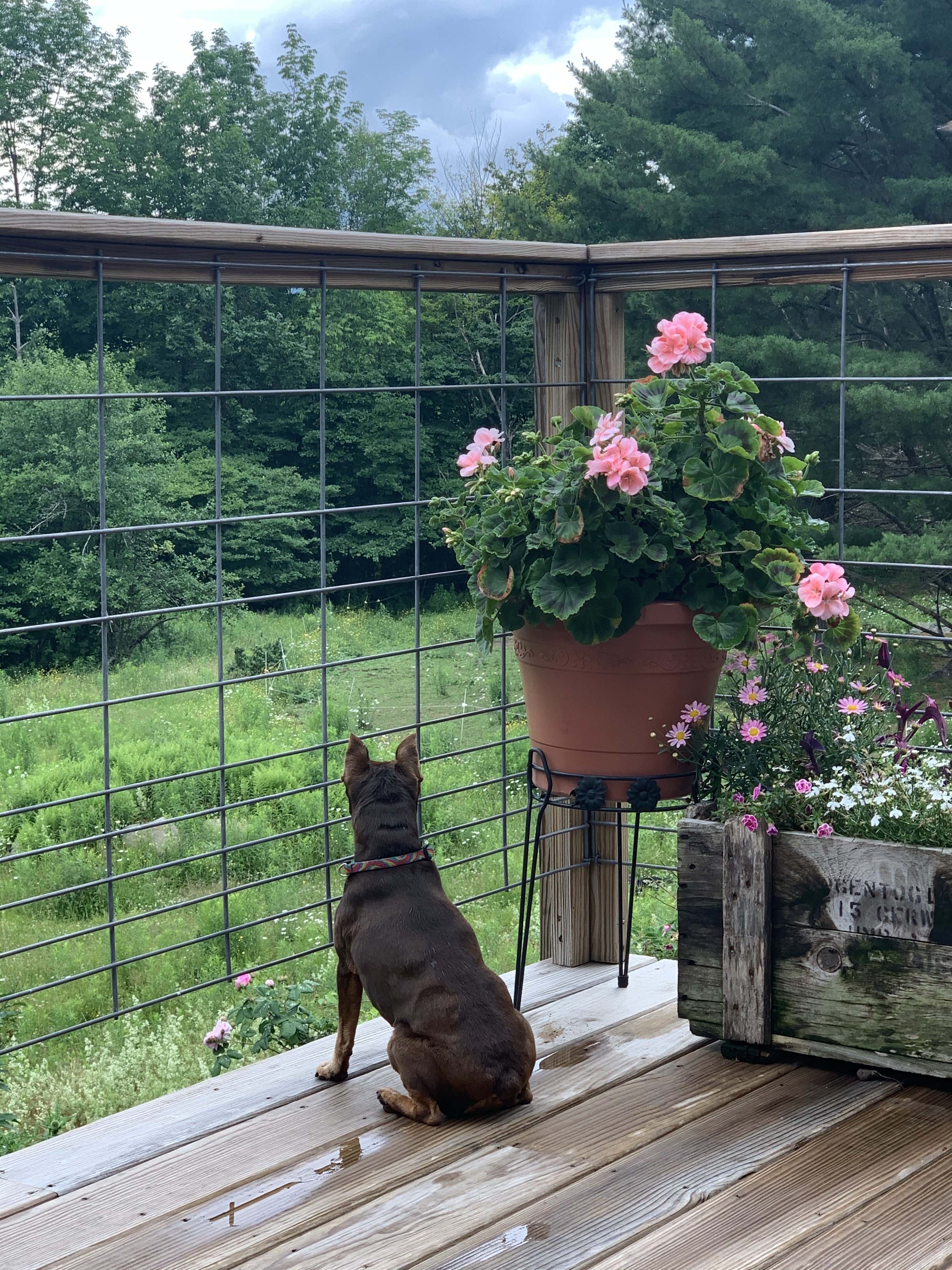 her enormous world became tiny and frightening. she got lost in the house, smacking into walls that she’d maneuvered nimbly around for years, tumbling down the front steps, wandering into the edge of the woods and getting stuck there by saplings. her ears and nose seemed to be as confounded as her eyes. my voice echoed off the trees. she’d wander in circles, unable to find me. i had to teach her a new command to take a treat, because she didn’t seem to be able to find one on the floor or in her dish. she didn’t adapt. she never developed coping mechanisms. three weeks later, she was just as likely to walk directly into a wall when aiming for the kitchen door as she was on the first day that she couldn’t see.